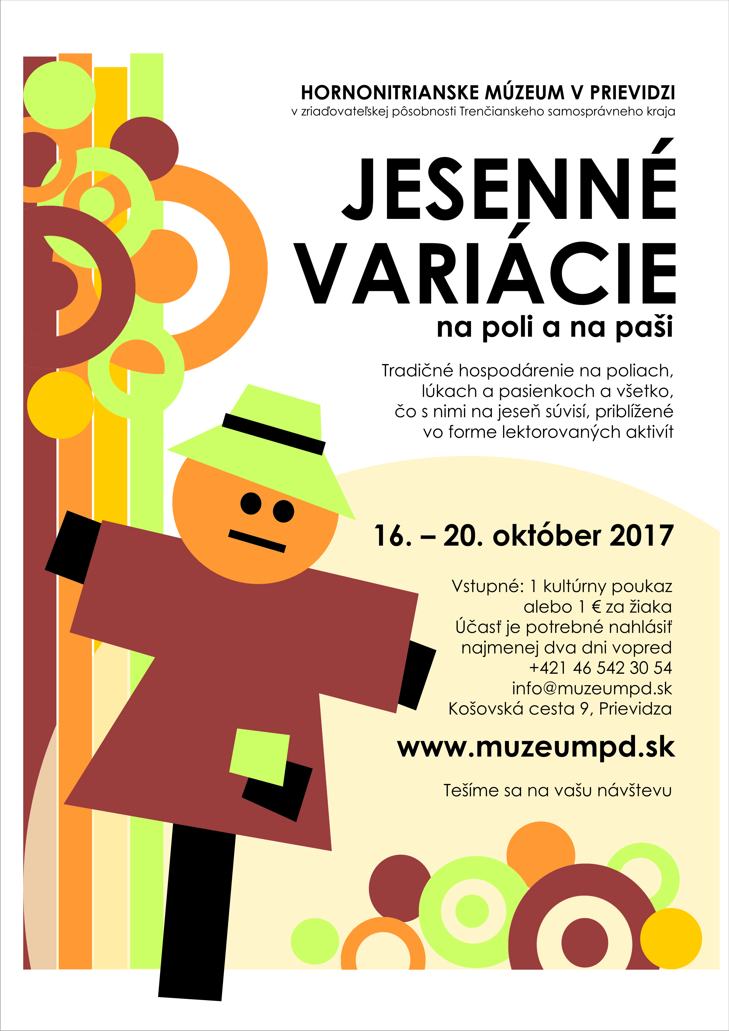 Jeseň je naozaj pestré ročné obdobie a zďaleka to neplatí len pre farby prírody! Rozmanité boli tiež práce, ktoré museli naši predkovia vykonať predtým, než si vo svojich skromných príbytkoch začali pri teplej peci užívať zaslúžený čas odpočinku od robôt na poliach, lúkach a pastvinách. Od poctivého vykonania týchto prác po stáročia záviselo ich živobytie v ďalšom roku. Návštevníci tohtoročnej podoby podujatia Jesenné variácie sa dozvedia, ktoré základné činnosti jesenné práce na poli a na paši zahŕňali, aké tradičné nástroje sa pri nich používali, ktoré zaujímavé zvyky sa s nimi spájali. Mladší žiaci okrem toho počas lektorom vedených aktivít rozpoznajú základné druhy zvierat, vytvárajúcich charakteristickú živú kulisu poľných prác, zatiaľ čo starší si vyskúšajú fungovanie trojpoľného systému a spoznajú rozdiely medzi hlavnými druhmi obilnín. A aby toľká námaha napokon nevyšla nazmar kvôli okrídleným hladošom, na záver všetci spoločne vystrojíme a prostred role postavíme strašiaka!